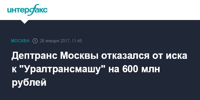 Москва. 26 января. INTERFAX.RU - Департамент транспорта и развития дорожно-транспортной инфраструктуры Москвы отказался от иска о взыскании с АО "Уралтрансмаш" (Свердловская область, входит в АО "НПК "Уралвагонзавод") более 592,84 млн рублей.