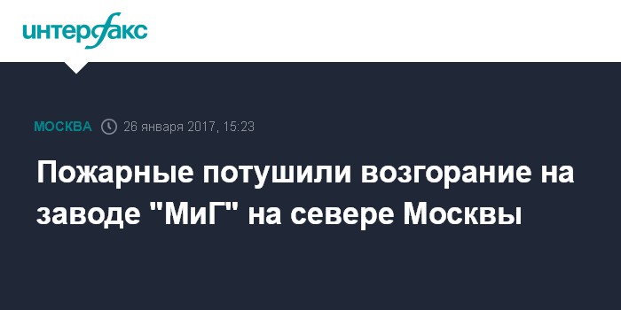 Москва. 26 января. INTERFAX.RU - Пожар в здании на территории завода "МиГ" на севере Москвы потушен. Об этом сообщил "Интерфаксу" в четверг источник в экстренных службах города.
