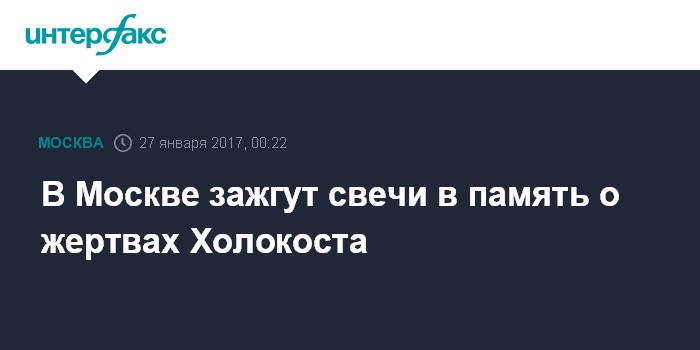 Москва. 27 января. INTERFAX.RU - Церемония зажжения свечей, приуроченная к Международному дню памяти жертв Холокоста, пройдет в пятницу в Еврейском музее и Центре толерантности в Москве. В мероприятии примут участие представители российских госструктур, международных организаций, дипломатических миссий, бывшие узники и ветераны-освободители, главный раввин России Берл Лазар, президент Федерации еврейских общин России Александр Борода, сообщает пресс-служба ФЕОР.
