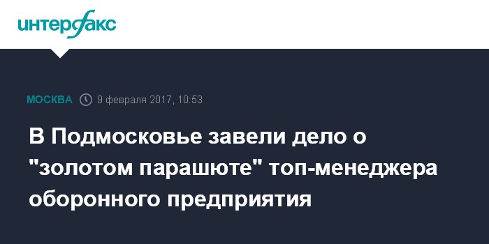 Москва. 9 февраля. INTERFAX.RU - Топ-менеджер одного из предприятий оборонно-промышленного комплекса в Подмосковье стал фигурантом уголовного дела после получения так называемого "золотого парашюта" в размере свыше 17 млн рублей. Об этом сообщил прокурор Московской области Алексей Захаров.