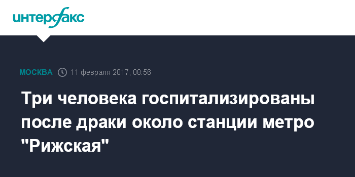 Москва. 11 февраля. INTERFAX.RU - Три человека пострадали в результате драки у станции метро "Рижская" в Москве, сообщил "Интерфаксу" в субботу источник в правоохранительных органах. По его словам, в конфликте участвовали порядка десяти человек.