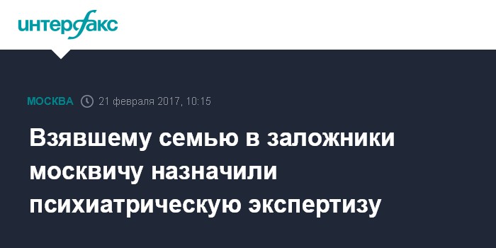 Москва. 21 февраля. INTERFAX.RU - Подозреваемому в захвате своей семьи в заложники мужчине назначена психолого-психиатрическая судебная экспертиза, сообщила "Интерфаксу" во вторник старший помощник руководителя столичного главка СКР Юлия Иванова.