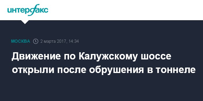 Москва. 2 марта. INTERFAX.RU - Движение на 23 км Калужского шоссе восстановлено после обрушения в строящемся тоннеле, сообщили "Интерфаксу" в четверг в пресс-службе Центра организации дорожного движения (ЦОДД).