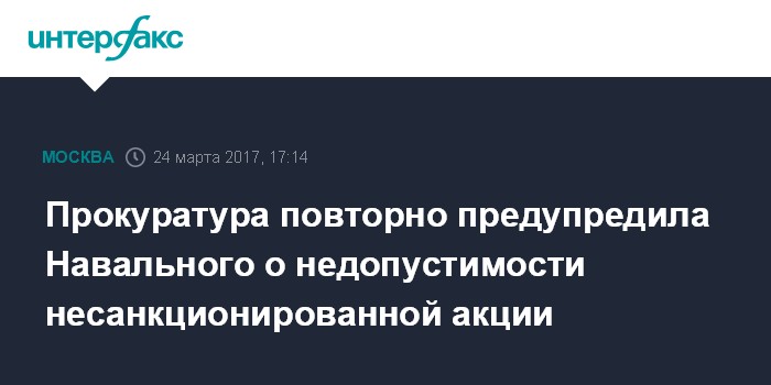 Москва. 24 марта. INTERFAX.RU - Столичная прокуратура вновь предупредила оппозиционера Алексея Навального и его соратников, что правоохранительные органы намерены пресечь несанкционированную акцию в случае ее проведения в центре Москве.