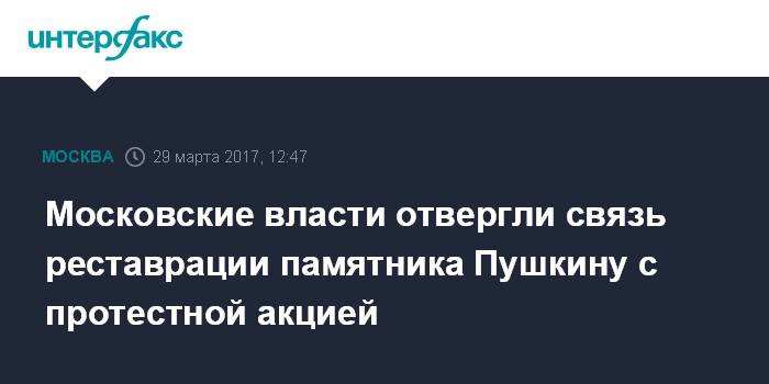 Москва. 29 марта. INTERFAX.RU - Реконструкция памятника поэту Александру Пушкину на Пушкинской площади была запланирована год назад и не связана с политическими акциями. Об этом заявил заместитель руководителя департамента культурного наследия Москвы Леонид Кондрашев.