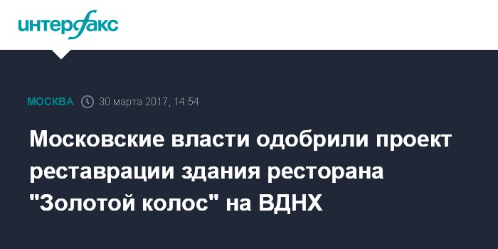 Москва. 30 марта. INTERFAX.RU - Заявка на оформление градостроительного плана земельного участка, необходимого для комплексной реставрации исторического здания ресторана "Золотой колос" на ВДНХ, одобрена на заседании Градостроительно-земельной комиссии, которое в четверг провел мэр Москвы Сергей Собянин.