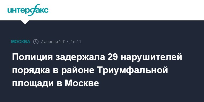 Москва. 2 апреля. INTERFAX.RU - Сотрудники полиции задержали 29 человек на Тверской улице в районе Триумфальной площади за нарушение общественного порядка в воскресенье, сообщили "Интерфаксу" в пресс-службе ГУ МВД РФ по Москве.