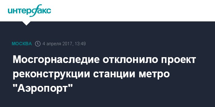 "Департамент культурного наследия Москвы отклонил от согласования представленную проектную документацию по выявленному объекту культурного наследия "Станция Московского метрополитена Горьковско-Замоскворецкой линии "Аэропорт", о чем уведомил ООО "Бюро А 495" письмом от 24 марта 2017 года", - говорится в сообщении.