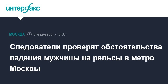 Москва. 8 апреля. INTERFAX.RU - Следователи проводят доследственную проверку после падения мужчины на рельсы в московском метро на станции "Бибирево", сообщила в субботу "Интерфаксу" официальный представитель ГСУ СК РФ по Москве Юлия Иванова.