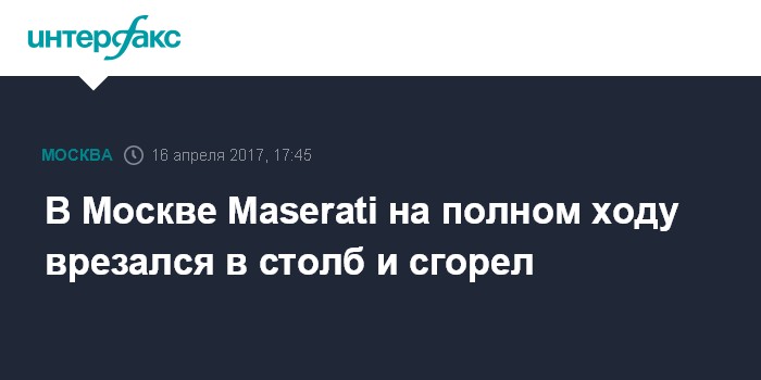 Москва. 16 апреля. INTERFAX.RU - Спорткар Maserati врезался в столб в центре Москвы, водитель погиб, сообщил "Интерфаксу" в воскресенье информированный источник.