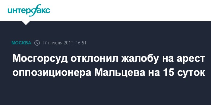 Москва. 17 апреля. INTERFAX.RU - Мосгорсуд признал законным административный арест на 15 суток оппозиционера Вячеслава Мальцева за неповиновение сотрудникам полиции во время несогласованной акции в центре Москвы 26 марта.