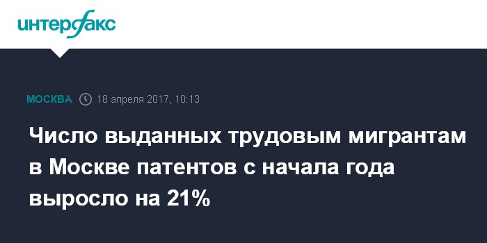 Москва. 18 апреля. INTERFAX.RU - Число патентов, выданных за январь-март 2017 года на осуществление трудовой деятельности иностранцами на территории Москвы, выросло на 21% к показателю первого квартала прошлого года, сообщили "Интерфаксу" в пресс-службе департамента экономической политики и развития столицы во вторник.
