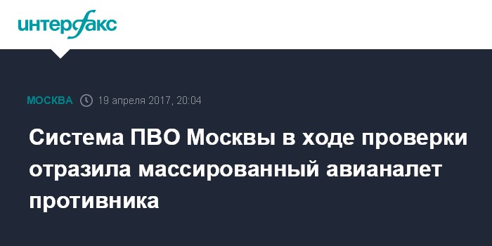Москва. 19 апреля. INTERFAX.RU - Подразделения противовоздушной обороны (ПВО) в рамках контрольной проверки отразили налет условного воздушного противника на Москву, сообщили "Интерфаксу" в среду в департаменте информации министерства обороны РФ.