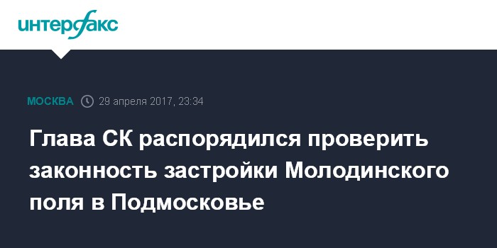 Москва. 29 апреля. INTERFAX.RU - Глава Следственного комитета Александр Бастрыкин распорядился провести процессуальную проверку по факту застройки на Молодинском поле в Подмосковье.