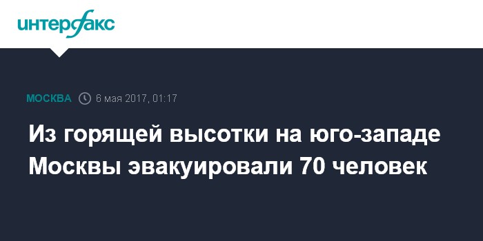 Москва. 6 мая. INTERFAX.RU - Порядка 70 человек эвакуировано в результате пожара в 35-этажном жилом здании на юго-западе Москвы, сообщили "Интерфаксу" в субботу в пресс-службе столичного главка МЧС.