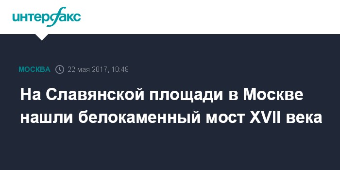 Москва. 22 мая. INTERFAX.RU - Во время ремонта водопровода на Славянской площади в Москве нашли белокаменный мост XVII века, сообщает сайт mos.ru. Единственное упоминание об этом древнем каменно-кирпичном мосте встречалось в документе почти четырехсотлетней давности.