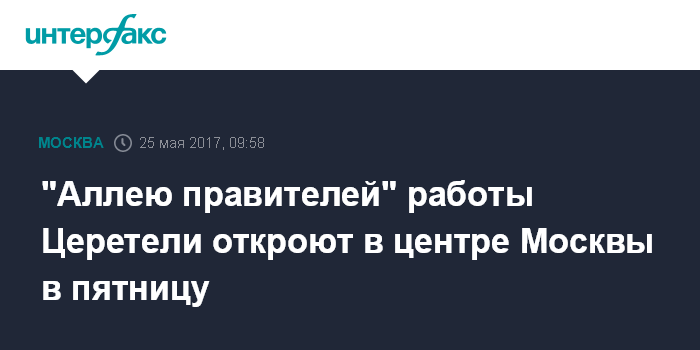 Москва. 25 мая. INTERFAX.RU - Торжественная церемония открытия "Аллеи правителей" работы известного скульптора, президента Российской академии художеств Зураба Церетели состоится в центре столицы 26 мая, сообщили "Интерфаксу" в четверг в управлении информации академии.