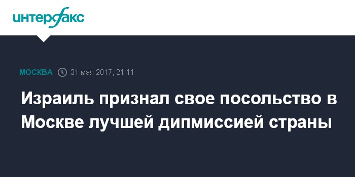 Москва. 31 мая. INTERFAX.RU - Посольство Израиля в России было признано лучшей дипмиссией страны за рубежом по итогам 2016 года, заявил "Интерфаксу" советник посольства Израиля по связям с прессой Алекс Кагальский.
