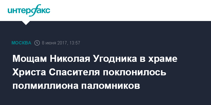 Москва. 8 июня. INTERFAX.RU - Уже полмиллиона верующих поклонилось мощам святителя Николая за две с половиной недели их пребывания в российской столице.