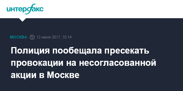 Москва. 12 июня. INTERFAX.RU - Полиция намерена незамедлительно пресекать любые провокации в ходе несогласованной протестной акции на Тверской улице в Москве, сообщили "Интерфаксу" в понедельник в пресс-службе столичного главка полиции.