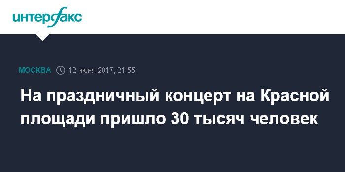 Москва. 12 июня. INTERFAX.RU - Праздничный концерт на Красной площади в Москве посетили 30 тысяч человек, сообщили "Интерфаксу" в понедельник в пресс-службе столичного главка МВД.