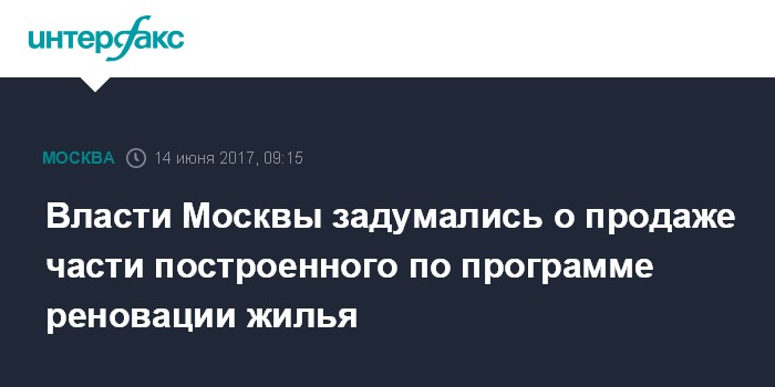 Москва. 14 июня. INTERFAX.RU - Власти Москвы намерены продать часть построенного жилья, чтобы окупить затраты на программу реновации жилья, пишет газета "Ведомости" со ссылкой на представителя мэрии.