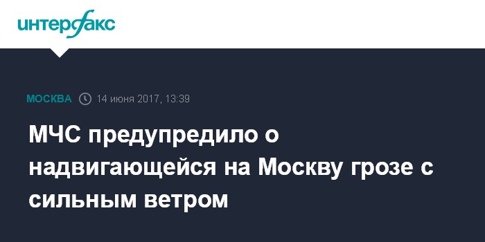 Москва. 14 июня. INTERFAX.RU - Гроза и ветер с порывами до 15 м/с ожидаются в Москве в ближайшие часы. Об этом сообщили "Интерфаксу" в среду в пресс-службе столичного главка МЧС.