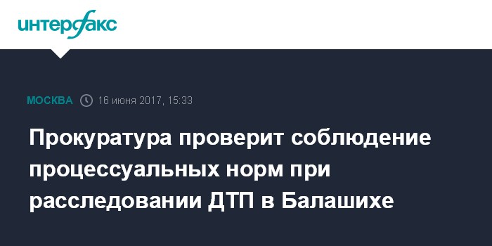 Москва. 16 июня. INTERFAX.RU - Подмосковная прокуратура истребовала материалы резонансного ДТП в Балашихе, в результате которого погиб шестилетний мальчик, сообщила "Интерфаксу" официальный представитель прокуратуры Московской области Марина Каурова.