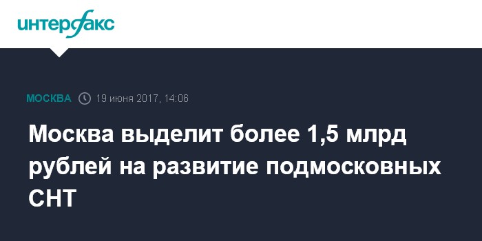 Москва. 19 июня. INTERFAX.RU - В течение трех лет из столичного бюджета на развитие инфраструктуры подмосковных садоводческих и дачных товариществ (СНТ) поступит около 1,53 млрд рублей, сообщил "Интерфаксу" председатель Союза дачников Подмосковья Никита Чаплин.