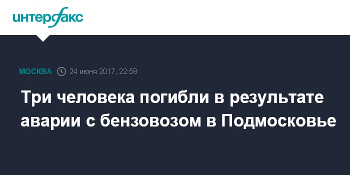 Москва. 24 июня. INTERFAX.RU - Три человека погибли в результате столкновения легковушки и бензовоза в Подмосковье, сообщили "Интерфаксу" в субботу в пресс-службе регионального главка МВД.