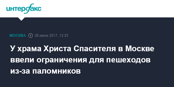 Москва. 28 июня. INTERFAX.RU - В связи с большим наплывом паломников и необходимостью обеспечения безопасности на близлежащей территории вокруг храма Христа Спасителя в Москве введены ограничения для движения пешеходов на период принесения мощей Николая Чудотворца, сообщает в среду штаб по организации паломничества.