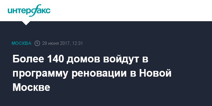 Москва. 29 июня. INTERFAX.RU - Около 143 домов войдут в программу реновации в Новой Москве. Об этом сообщил журналистам руководитель департамента развития новых территорий Москвы Владимир Жидкин в четверг.