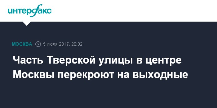 Москва. 5 июля. INTERFAX.RU - В связи с работами по благоустройству в рамках программы "Моя улица" в предстоящие выходные перекроют для движения часть Тверской улицы в центре столицы, сообщили "Интерфаксу" в пресс-службе Центра организации дорожного движения в среду.