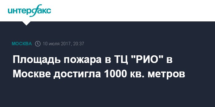 Москва. 10 июля. INTERFAX.RU - Площадь пожара в ТЦ "РИО" на Дмитровском шоссе в Москве, по предварительной информации, составляет около 1000 квадратных метров, сообщили "Интерфаксу" в пресс-службе столичного МЧС.