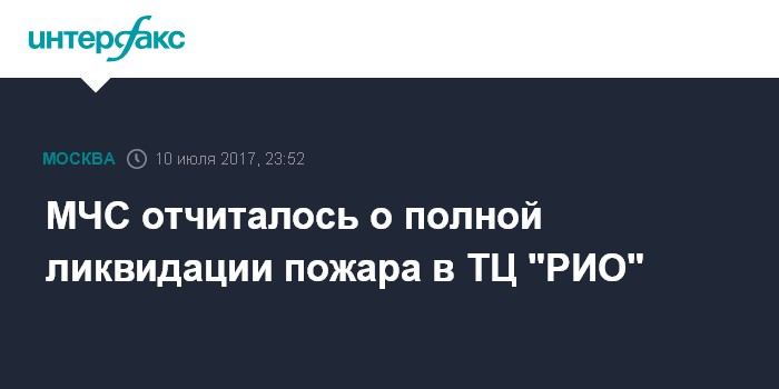 Москва. 10 июля. INTERFAX.RU - Ликвидирован пожар в торговом центре "Рио" на Дмитровском шоссе в Москве, сообщили "Интерфаксу" в понедельник в пресс-службе столичного главка МЧС.