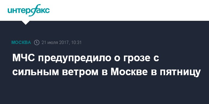 Москва. 21 июля. INTERFAX.RU - Столичный главк МЧС продлил на пятницу предупреждение о сильных порывах ветра и дожде с грозой, сообщили в пресс-службе ГУ МЧС РФ по Москве.