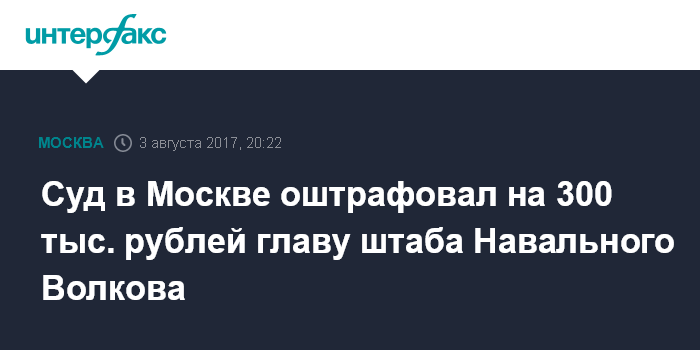 Москва. 3 августа. INTERFAX.RU - Симоновский суд Москвы назначил штраф в 300 тыс. рублей главе штаба оппозиционного политика Алексея Навального Леониду Волкову за повторное нарушение правил проведения публичного мероприятия, передает корреспондент "Интерфакса".