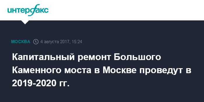 Москва. 4 августа. INTERFAX.RU - Первый капитальный ремонт Большого Каменного моста, ведущий к Боровицкой площади у стен Московского Кремля, планируется провести в 2019-2020 годах, следует из документации, размещенной в Единой информационной системе госзакупок.