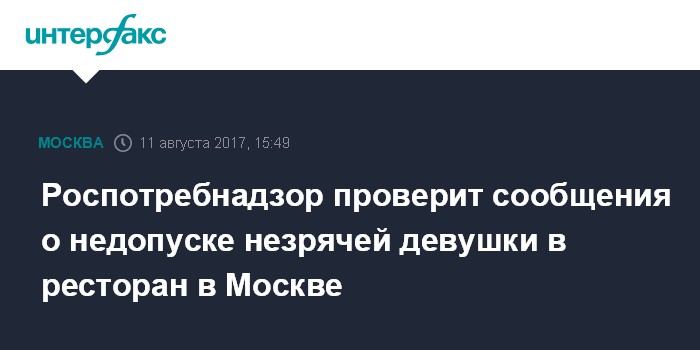 Москва. 11 августа. INTERFAX.RU - Столичное управление Роспотребнадзора проведет проверку информации о том, что незрячую девушку не пустили в ресторан на Останкинской башне, сообщает пресс-служба ведомства.