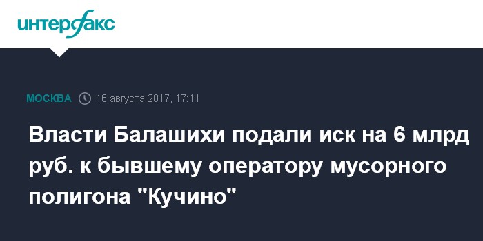 Москва. 16 августа. INTERFAX.RU - Администрация Балашихи подала два иска к компании ЗАО "Заготовитель", которая ранее эксплуатировала мусорный полигон "Кучино", закрытый в июне этого года, сообщил глава городского округа Сергей Юров.