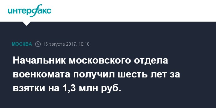 Москва. 16 августа. INTERFAX.RU - Глава отдела столичного военкомата приговорен к шести годам лишения свободы и крупному штрафу за получение взяток на общую сумму более 1,3 млн рублей. Об этом сообщили в Главной военной прокуратуре (ГВП).