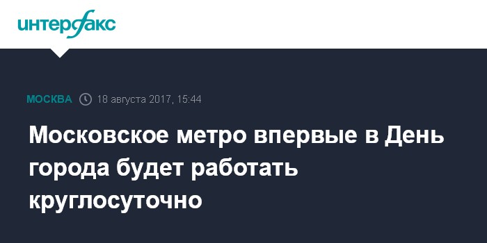 Москва. 18 августа. INTERFAX.RU - Московский метрополитен и Московское центральное кольцо (МЦК) впервые на День города, который в этом году столица отмечает 9 и 10 сентября, будут работать круглые сутки. Об этом сообщил в твиттере мэр Москвы Сергей Собянин.