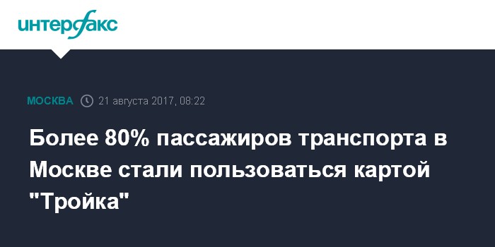 Москва. 21 августа. INTERFAX.RU - Количество пассажиров, которые используют карту "Тройка" в Московском метрополитене, достигло 83,5%, в наземном транспорте - более 82%, сообщается на сайте столичной мэрии в понедельник.