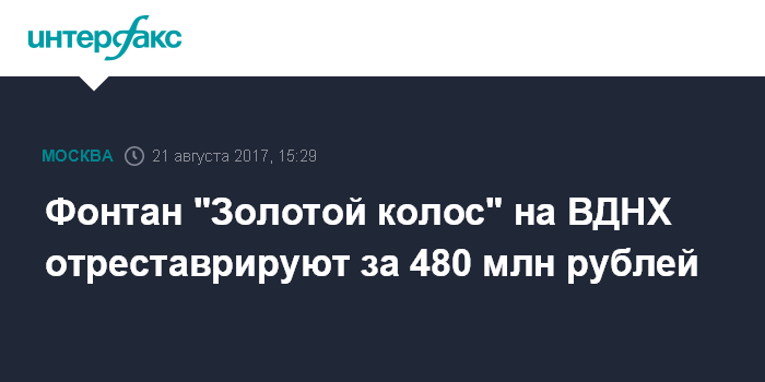 Москва. 21 августа. INTERFAX.RU - Расположенный на ВДНХ фонтан "Золотой колос", являющийся объектом культурного наследия федерального значения, будет отреставрирован не позднее 2018 года, следует из документации, размещенной на официальном портале госзакупок.