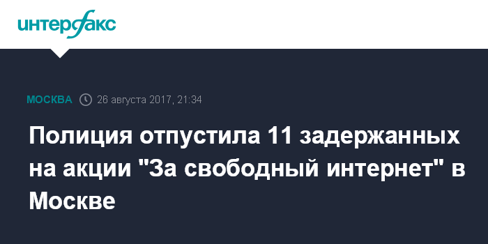 Москва. 26 августа. INTERFAX.RU - Задержанные в Москве в ходе митинга "За свободный интернет" 11 человек покинули отдел полиции без составления протоколов, ещё шестерых обвиняют в нарушении правил проведения акции, сообщил один из задержанных, член движения "Открытая Россия" Никита Сафронов.