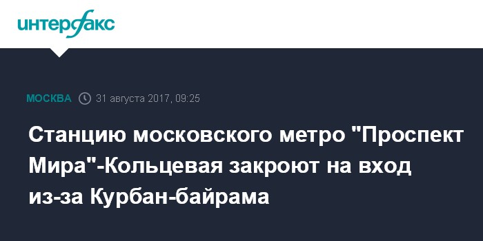 Москва. 31 августа. INTERFAX.RU - Станция "Проспект Мира" Кольцевой линии Московского метро 1 сентября в связи с проведением праздника Курбан-байрам будет работать в особом режиме. Об этом сообщили "Интерфаксу" в пресс-службе метрополитена в четверг.