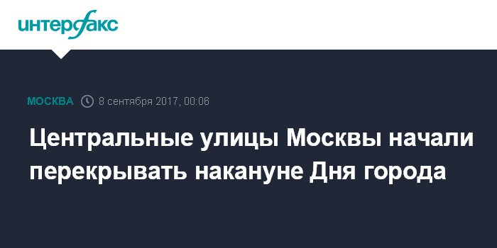 Москва. 8 сентября. INTERFAX.RU - В связи с празднованием Дня города в Москве начали перекрывать улицы для движения автомобилей, сообщили в пятницу "Интерфаксу" в пресс-службе департамента транспорта столицы.