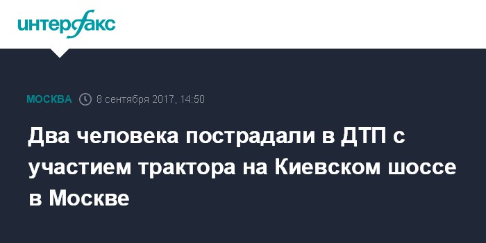Москва. 8 сентября. INTERFAX.RU - Два человека, в том числе беременная женщина, пострадали в результате столкновения трактора и легкового автомобиля на Киевском шоссе в Москве, сообщил "Интерфаксу" осведомленный источник.