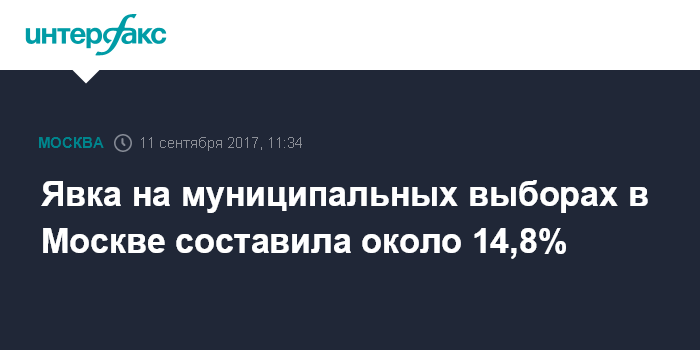 Москва. 11 сентября. INTERFAX.RU - По предварительным данным, явка на выборах депутатов муниципальных образований столицы в минувшее воскресенье составила чуть ниже 15%, сообщил председатель Мосгоризбиркома Горбунов.