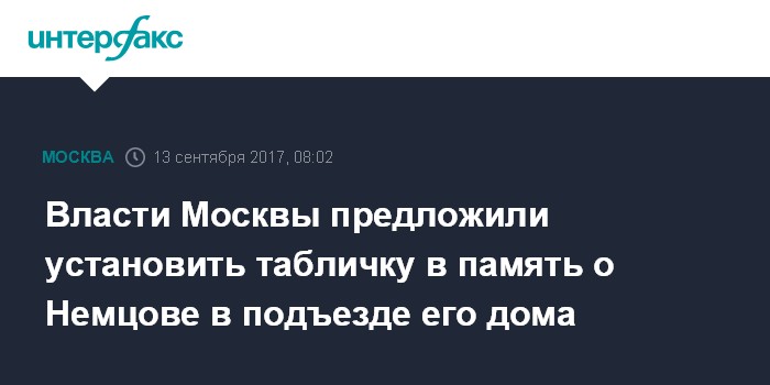 Москва. 13 сентября. INTERFAX.RU - Инициаторы установки мемориальной доски оппозиционеру Борису Немцову, убитому в Москве в феврале 2015 года, не нарушат закон, если разместят памятный знак в подъезде дома, где жил политик, сообщил "Интерфаксу" в среду источник в столичной администрации.